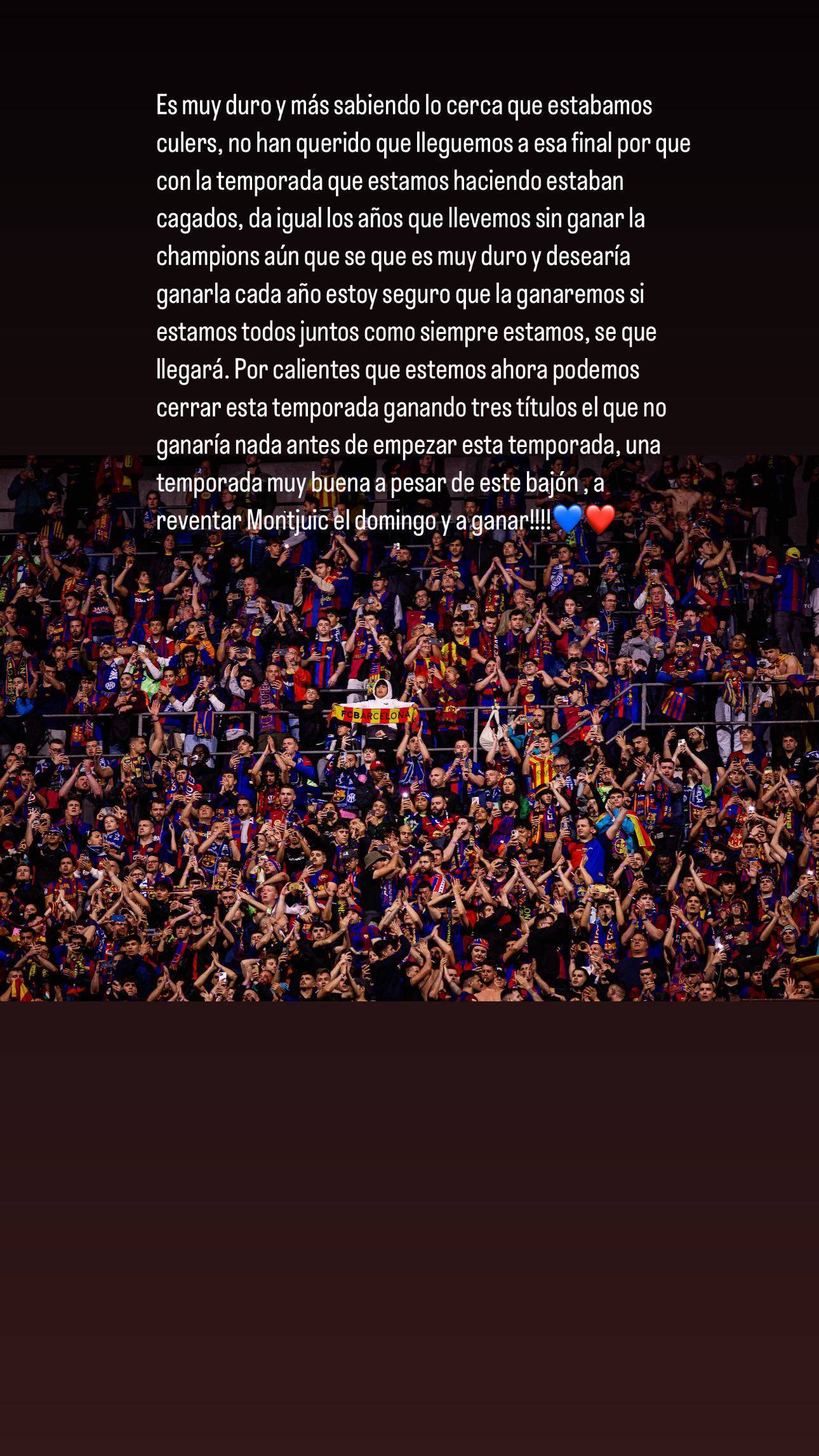 对此,加维在ins发文:“这真的很艰难,尤其是考虑到我们曾经多么接近冠军。他们不想我们进入决赛,因为我们这个赛季表现太出色了,他们害怕了。无论我们上次赢得欧冠冠军已经是什么时候,这都无关紧要。虽然这很艰难,我希望每年都能赢得冠军,但我相信,只要我们像往常一样团结一致,我们最终会赢得冠军。冠军终将到来。”